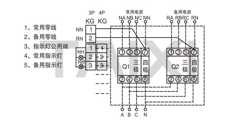 接線時,常用電源N應(yīng)接入常用電源執(zhí)行斷路器QN,備用電源R應(yīng)接入備用電源執(zhí)行斷路器QR。當(dāng)QN和QR為四線斷路器時,接線方式按接線圖,其中QN和QR的1、3、5為三相(A、B、C)進(jìn)線端,2、4、6為三相出線端,7為零線(N)進(jìn)線端,8為零線出線端。若選用斷路器為三極斷路器,則必須將常用電源(N)的零線NN和備用電源(R)的零線NR同時接到三極專用接零線端子KG上。具體操作見接線圖。雙電源切換開關(guān)自動控制器的工作電源取斷路器QN和QR的進(jìn)線端A相和零線N,若選用斷路器為三極斷路器時,必須要接零線NN和NR,該三極專用接線零端子在兩臺斷路器中間,在自動電源切換開關(guān)安裝,接線過程中,切不要把原接在斷路器進(jìn)線端的本機(jī)控制器線忘掉,碰斷或短路等。